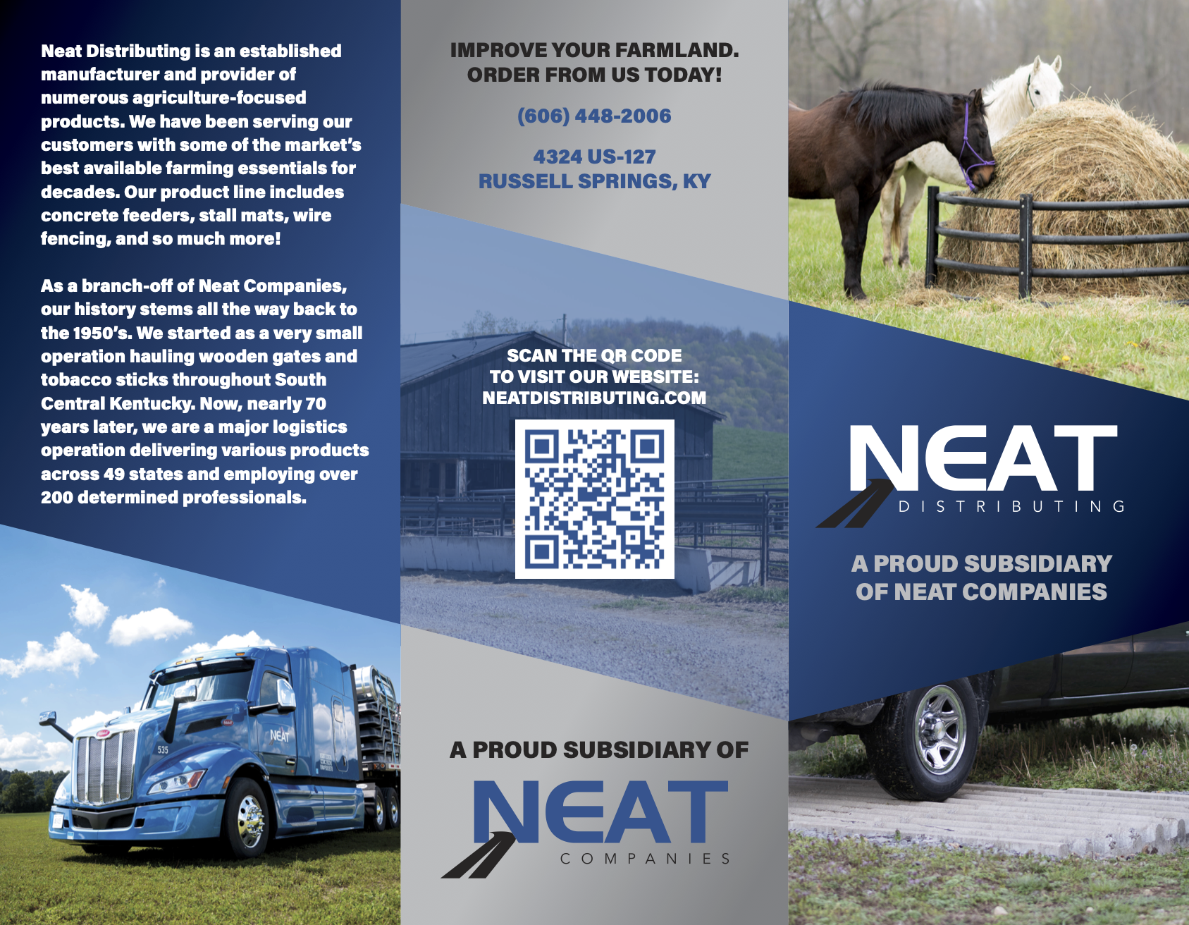 This brochure is intended to be passed out in any setting, but especially at vendor trade shows. The information presented about Neat Distributing needed to be all-encompassing, but not too in-depth. I wanted something that would easily resonate with potential vendors and potential end-users, enticing both audiences to inquire further about our business.