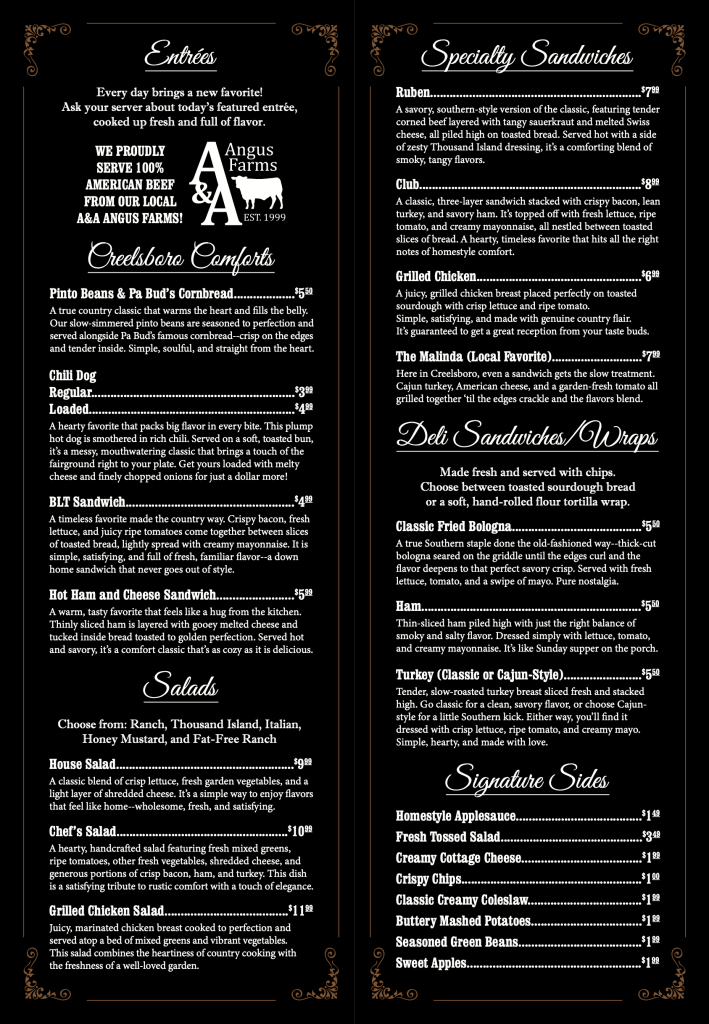 This was a pretty straight-forward project. I had already helped Paula craft her brand image from scratch. She heavily utilizes chalkboards in her store and restaurant for product sections, general greeting signage, and updates on the rotating entrees or seasonal offerings. We wanted to combine that aesthetic with a rustic one to emphasize the establishment’s historic roots in the community, hence the handwritten white-on-black font for “Paula’s” and the bronze-plated style used for “Creelsboro” and the circular frame of the logo. As is common in this line of work, much of what I created from that point needed to fit into that framework we had established, which you can see in this menu design.